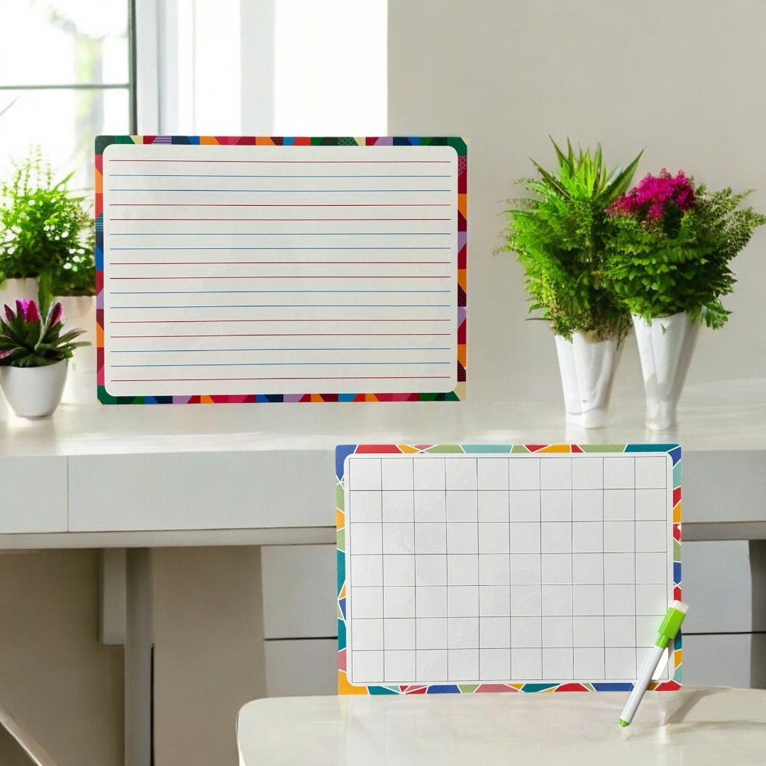 Dual-Sided Learning Fun: One side features lined sections for alphabet practice, while the other includes a grid for writing numbers and solving basic math problems.