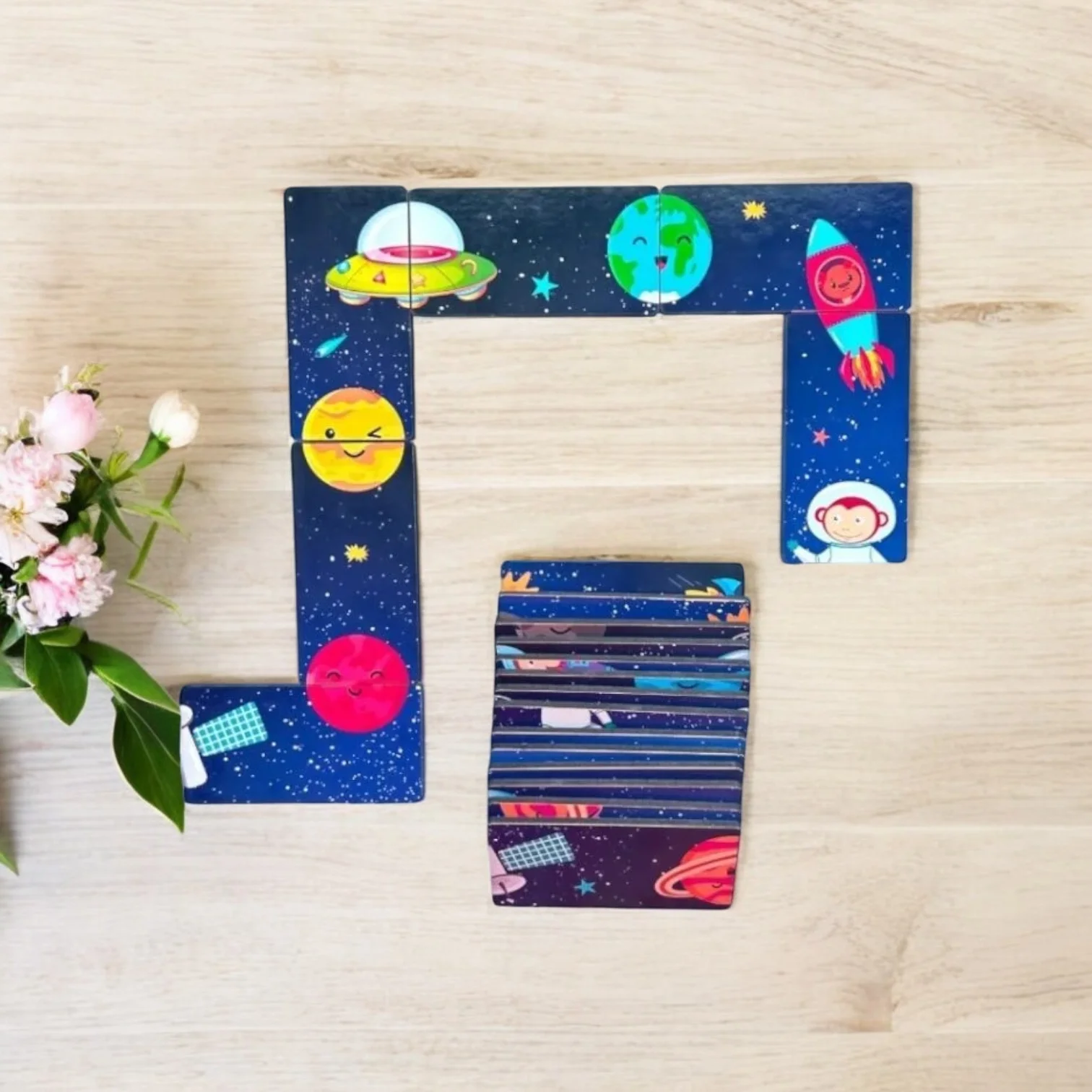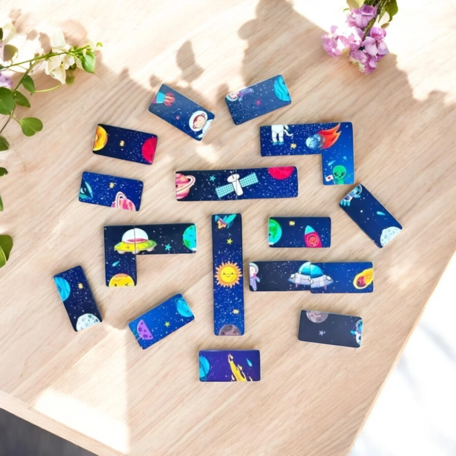 Set off on an exciting space exploration with our Space Adventure Dominoes Game for Kids! This captivating set features beautifully illustrated wooden dominoes showcasing various space-themed images, including planets, astronauts, rockets, UFOs, and more. Each piece is designed for easy handling by little hands, helping children develop fine motor skills, hand-eye coordination, and matching abilities as they pair space objects correctly.