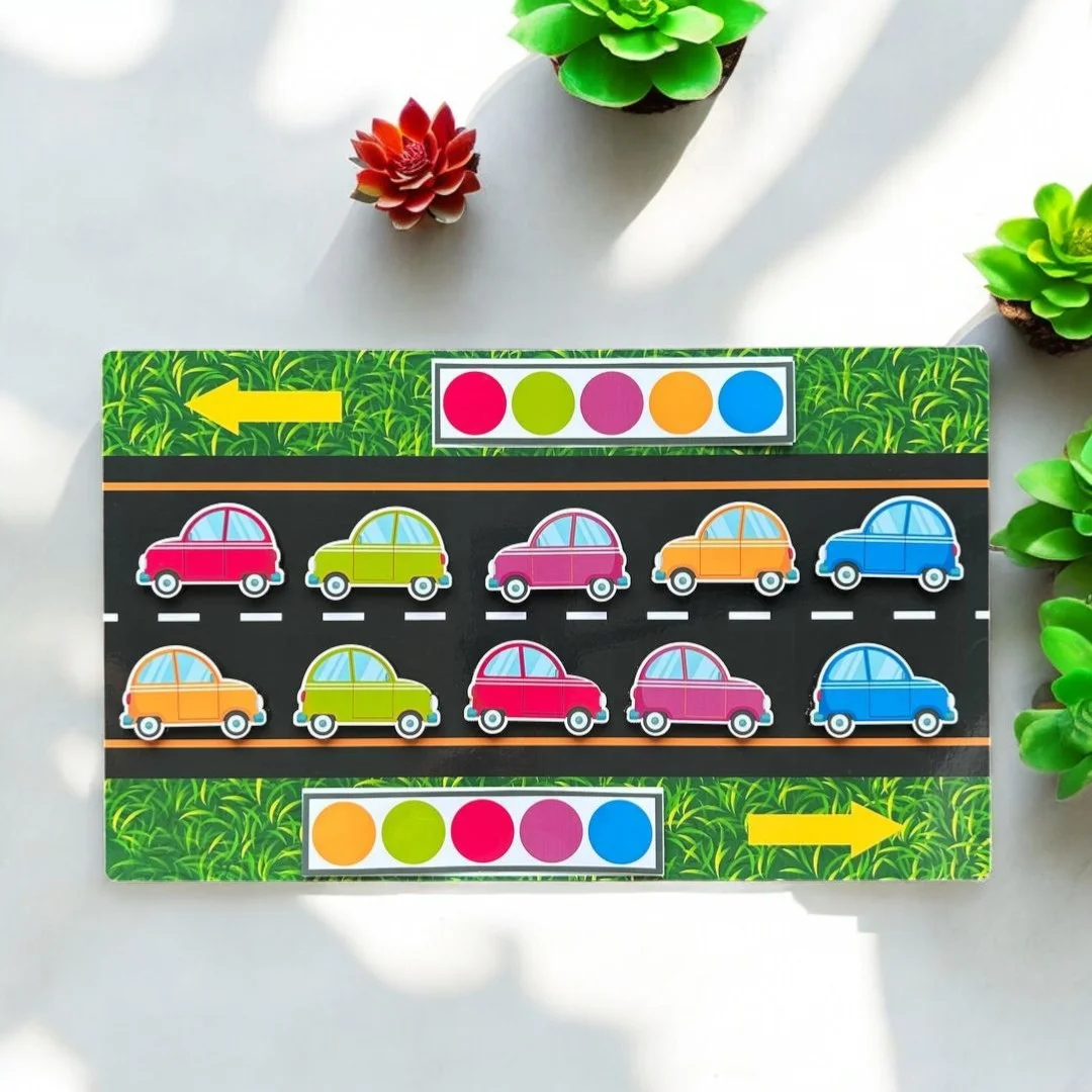 The Color Matching Car Sorting Set is an interactive and fun learning tool for kids, featuring 10 colorful cars and a matching road board. Children match the cars to the correct colors displayed on the road, enhancing their learning experience while keeping them engaged. With its vibrant design and easy-to-handle pieces, this activity is perfect for promoting hands-on learning and play.Total 18 cards Included.