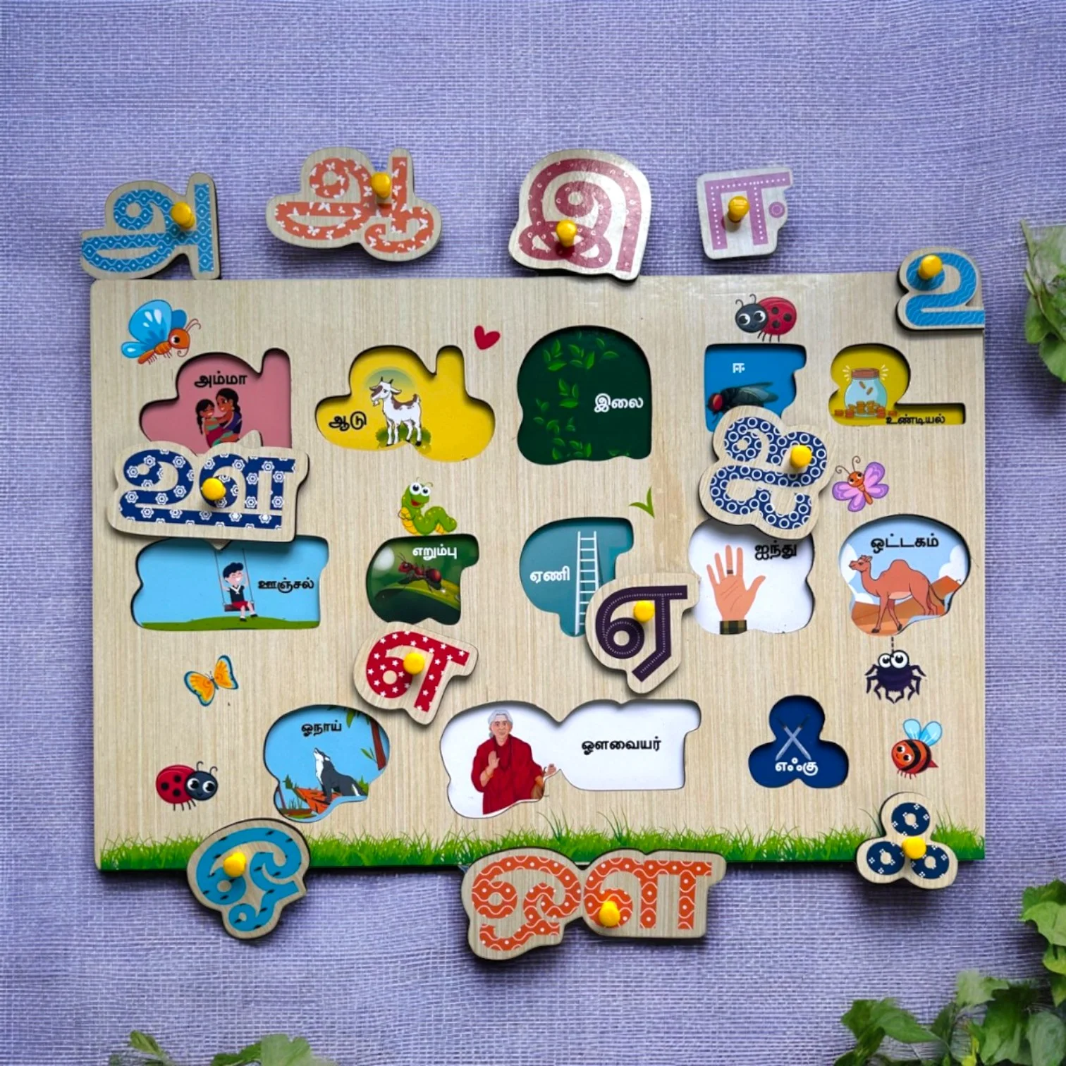 Introduce your little ones to the beauty of Tamil vowels with our enchanting wooden puzzle! From ‘அ’ for ‘அம்மா’ (mother) to ‘ஆ’ for ‘ஆடு’ (goat), each letter bursts with vibrant colors and connects children to the richness of our கலாச்சாரம் (culture).